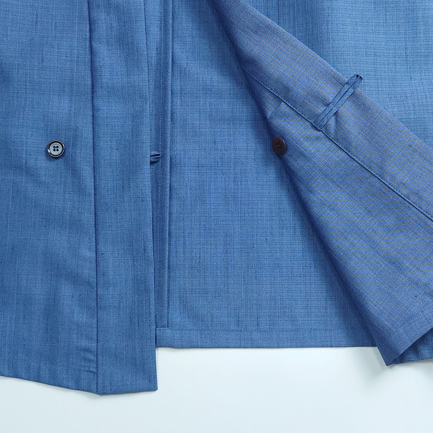 メンズ着物の構造を基に、解いた着物からのリメイクも想定して設計されたオリジナルの直垂型トップス。袖は日常着の着物に見られる筒袖や巻袖をベースに、袂(たもと)を省いた設計とすることで、日常での扱いやすさを高めました。フロントはボタン留めとし、脇縫いにはポケットを配置することで、トップスとしての実用性を確保しています。丈は扱いやすいミドル丈で、裾がわずかに前下がりになったバランスは洋服との自然なスタイリングを可能にします。